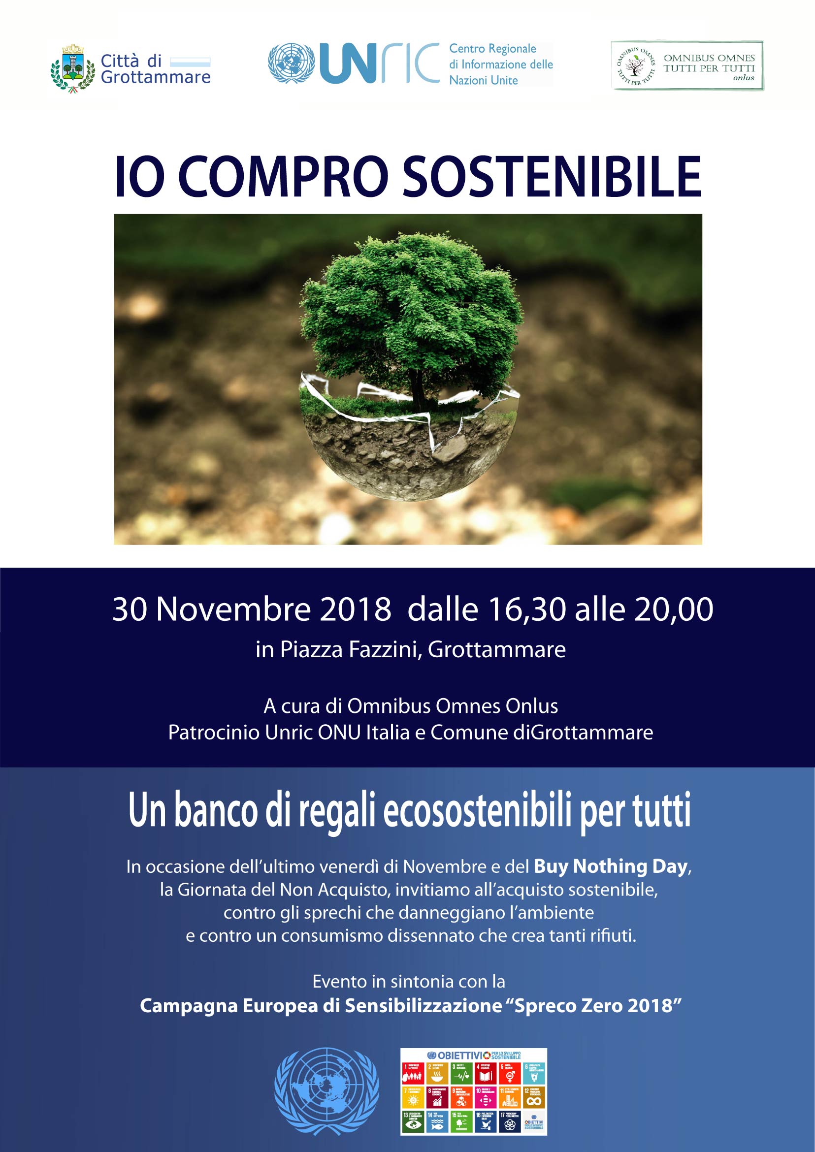 GROTTAMMARE – Venerdì 30 novembre dalle ore 16,30 alle 20, in Piazza Fazzini a Grottammare, sarà aperto il banco di regali completamente gratuiti relativi l’iniziativa “Io Compro Sostenibile” della Omnibus Omnes Onlus, con il patrocinio Unric-Onu Italia e del Comune di Grottammare. Chiunque può prendere gratis oggetti utili, nuovi o usati e in buono stato, da libri a abbigliamento per bambini, da dvd a oggetti per la casa. Ma chiunque può anche regalare. «Nulla andrà sprecato, consegneremo alla Caritas di San Benedetto del Tronto tutti i doni utili e tardivi. Sono arrivate molte richieste di informazioni, contiamo su una buona partecipazione» dice Raffaella Milandri, presidente della Omnibus, la Onlus fervida promotrice della originale iniziativa contro lo spreco e a favore del riciclo «L’invito per tutti è quello di riflettere e adottare una vita all’insegna dell’acquisto sostenibile, contro gli sprechi e i rifiuti a danno dell’ambiente, e contro la disparità sociale che si crea di fronte alla capacità d’acquisto».  “Io Compro Sostenibile” si collega al Buy Nothing Day, la Giornata del Non Acquisto, ma anche alla Campagna Europea di Sensibilizzazione “Spreco Zero 2018”.