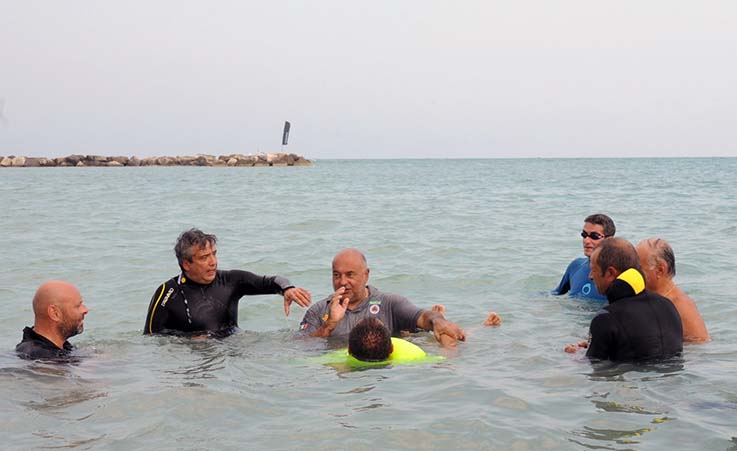 Il maresciallo Del Carro, ha relazionato sui ruoli istituzionali del nucleo operativo dei sommozzatori della Guardia costiera e le finalità dei rescue swimmer negli scenari dell’immigrazione, tema questo di grande attualità, mentre il tema trattato dal maresciallo Paolo Antolini, è stato quello dei possibili incidenti iperbarici e la loro gestione. Con il presidente Perrotta si è entrati nel vivo dell’attività con la teoria del soccorso a terra e in mare, normative vigenti, i pericoli della spiaggia, il progetto Baby Rescue, i nodi ed altro ancora. Particolarmente apprezzata l’attività svolta in mare, in zona Sentina, con l’ausilio del gommone, con la dimostrazione del salvamento in mare di un pericolante con l’esecuzione delle tecniche natatorie e le procedure che il caso richiede.