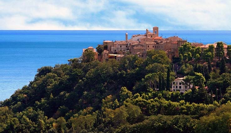 Era sorta nel VI secolo a.C. ad opera dei Piceni, diventata poi romana, stando alle documentazioni, nel 286 a.C. Il castello e la fortificazione, con il nuovo insediamento, sono più recenti, vengono costruiti nel Medio Evo, XII-XIII secolo, su una collina a circa cento metri s.l.m. con un declivio paesaggisticamente assai scenografico che scende fino a poche centinaia di metri dal mare. Parliamo di Torre di Palme, meno di mille abitanti, borgo dal fascino straordinario, vicino Porto San Giorgio, nelle Marche. Oggi è frazione di Fermo ma è stato un fiero Comune autonomo fino al 1877. In origine il nome era Turris Palmae.