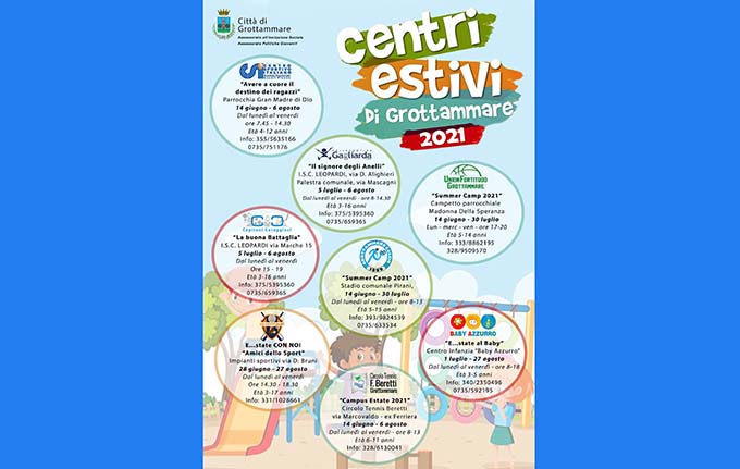 “Summer Camp 2021” della ASD Union Fortitudo Basket di Grottammare, presso i locali e il campetto messo a disposizione dalla Parrocchia Madonna della Speranza; “ASD Grottammare 2020 E…state con noi – Amici x lo Sport” della ASD Grottammare 2020 in partnership con il Centro Sportivo Italiano di Grottammare, presso gli impianti sportivi in Via D. Bruni; “Summer Camp 2021” proposto dalla Ssd Grottammare Calcio 1899 presso lo Stadio comunale Pirani; “E…state al Baby Azzurro” presentato dalla Soc. Coop. Sociale Baby Azzurro di San Benedetto del Tronto presso la struttura del Centro Infanzia “Baby Azzurro” in via Lombardia; “Campus Estate 2021” della ASD Circolo Tennis F. Beretti con attività presso la struttura sportiva in zona Ex Ferriera.