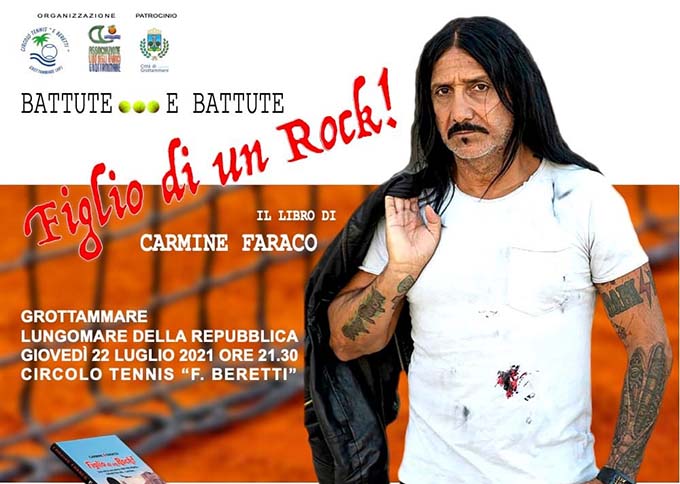 GROTTAMMARE – L’Associazione Lido degli Aranci e il Circolo Tennis “Beretti” di Grottammare presentano “Figlio di un Rock”, il libro di Carmine Faraco. Carmine Faraco è un artista a 360°. Grande amico della città dai lontani anni Novanta, ha deciso di presentare il suo libro proprio a Grottammare, giovedì 22 luglio alle ore 21.30, con battute su battute ed una cerimonia piena di sorprese. Dopo aver recitato con i più grandi attori italiani come Massimo Troisi in “Ricomincio da tre”, con Alberto Sordi ne “Il tassinaro”, con Lino Banfi in “L’Allenatore nel pallone”, con Jerry Calà e Diego Abatantuono ne “I fichissimi”, con Luciano De Crescenzo in “Così parlò Bellavista”, con Nino Manfredi in “Dio ci ha creato gratis”, ha sfondato nel mondo del Cabaret prima con il “Seven Show” e il “Maurizio Costanzo Show” e poi con “Colorado Cafè” e “Made in Sud”. Il suo mitico personaggio è “L’uomo dei Pecchè”, con il quale analizza in maniera dissacrante i testi delle canzoni a noi più conosciute, ulteriormente ridicolizzate nel momento in cui paragona i vari cantanti e cantautori italiani come Venditti, Battiato, Alex Britti, Tiziano Ferro, alle grandi Band inglesi come i Pink Floyd, i Deep Purple e così via.