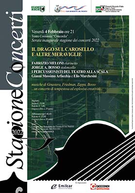 SAN BENEDETTO DEL TRONTO – Venerdì 4 febbraio, alle ore 21, al cinema teatro “Concordia” di San Benedetto del Tronto, è in programma la serata inaugurale della Stagione dei Concerti 2022 promossa dall’Amministrazione comunale e dalla locale sezione della “Gioventù musicale d’Italia”. La stagione si apre con un concerto d’eccezione, uno spettacolo di tempestosa creatività dal titolo “Il drago sul carosello ed altre meraviglie…” realizzato dal primo clarinetto solista del Teatro alla Scala Fabrizio Meloni, dal compositore violoncellista Jorge A. Bosso e dai percussionisti del Teatro alla Scala Gianni Massimo Arfacchia e Elio Marchesini. I tre artisti si riuniscono in un progetto insolito ed originale che spazia dalla musica classica alla musica da film in un’esplosione di timbri colorati che accompagna in un viaggio di suoni cosmici. Nel programma i canoni di Bach, la famosa “Toccata di Ginastera” celebrata da Emerson, Lake & Palmer, le composizioni mozzafiato del film di Kubrick “Eyes Wide Shut”, una versione elettrizzante di “Sinister Footwear” del leggendario Frank Zappa.