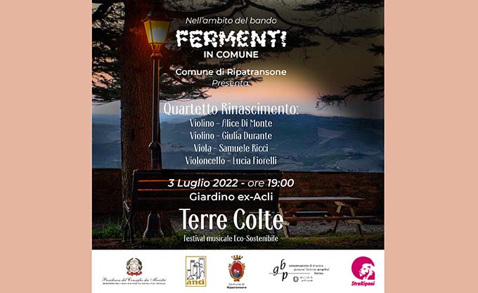 RIPATRANSONE – Torna il festival eco-sostenibile realizzato dall’associazione Straripani e l’Amministrazione Comunale di Ripatransone, che volge all’appuntamento finale di questa prima edizione tenutasi nell’incantevole cornice del giardino ex-Acli al cospetto del Belvedere Piceno. Il Festival è stato realizzato grazie al contributo di Anci con il bando “Fermenti in Comune”. Domenica 3 luglio andrà in scena dalle ore 19 il concerto del Quartetto Archi “Rinascimento” del Conservatorio “G.B.Pergolesi” di Fermo, ente partner di questo evento grazie alla collaborazione del Maestro Donato Reggi, docente di musica d’insieme per archi e del direttore Nicola Verzina. «Questo evento, vuole affermare ancora una volta l’importanza di riscoprire la bellezza dell’essenzialità e della buona musica, specie in periodo climatico complesso come questo dove l’inquinamento e la siccità rendono invivibili le grandi aree urbane» sono le parole del Presidente degli StraRipani, Remigio Giannetti. Il concerto sarà diviso in due parti: un viaggio tra la musica classica e quella moderna spaziando tra i grandi compositori italiani e stranieri.