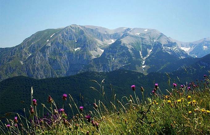 La ninfa Maja era la più anziana e la più bella di sette sorelle chiamate Pleiadi, figlie di Atlante e della ninfa Pleione. Maja generò da Zeus il figlio Hermes. Una leggenda racconta che dalla Frigia la nave di Maja con il figlio Gigante, ferito gravemente in battaglia, approdò alle coste abruzzesi. Per salvare il figlio la ninfa cercava un’erba miracolosa che nasceva sulle pendici del Gran Sasso. Ma il freddo e il gelo avevano inaridito la terra e fatto scomparire ogni forma di vita, perciò Gigante non curato morì. Maja piangendo lo seppellì in alto sulla montagna. Quando giunse la primavera con il suo tepore e la sua luce ricomparvero erbe e fiori, tra cui l’erba miracolosa. Fu allora che Maja impazzita dalla collera e dal dolore estirpò ogni filo d’erba e si gettò dalla cima di un’alta montagna vicina. In ricordo del suo sacrificio la montagna venne chiamata Majella e osservata dal cielo richiama i tratti di un corpo femminile con le braccia protese verso il mare. L’immagine del Gran Sasso – o meglio del Corno piccolo con la cima, la parete nord e la prima spalla – se guardata in verticale assomiglia al profilo di un gigante di pietra.