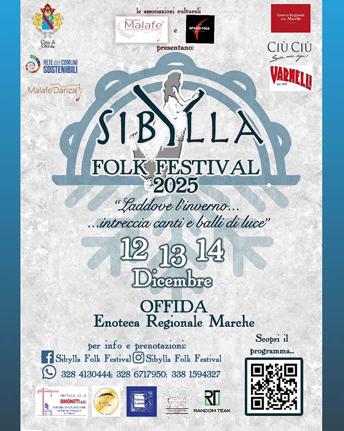 Si parte venerdì 12 dicembre con apericena e concerto dei Provvisorio Popolare, simbolo della nuova musica popolare italiana. Sabato 13 dicembre si terranno i laboratori di danza “Il pericolo dell’anima” con Anna Dego e “Pizzica Pizzica di Villa Castelli” con Giovanni Amati. La serata proseguirà con l’aperitivo e concerto di Skattacorë più l’Orchestra della Mezzanotte. Domenica 14 dicembre ci saranno laboratori per bambini, famiglie e adulti di “Dialogo sonoro e Body percussion” con Marco Bellone, “Radici in movimento” con Angela Esposito e stage di tamburo vesuviano con Dario Mogavero. Il festival chiuderà con aperitivo e concerto di Dario Mogavero e Francesco Di Cristofaro. «Siamo orgogliosi di accogliere nuovamente a Offida il “Sibylla Folk Festival” – commenta l’assessora alla Cultura, Marica Cataldi – un momento significativo per la valorizzazione della cultura popolare e delle nostre tradizioni che quest’anno si svolgerà a dicembre. L’Amministrazione sostiene con convinzione iniziative come questa, capaci di unire ricerca artistica, partecipazione attiva e promozione del patrimonio immateriale». Prenotazione obbligatoria. Info e iscrizioni: Claudia 328/6717950 – Morena 328/4130444 – Marzia 338/1594327.