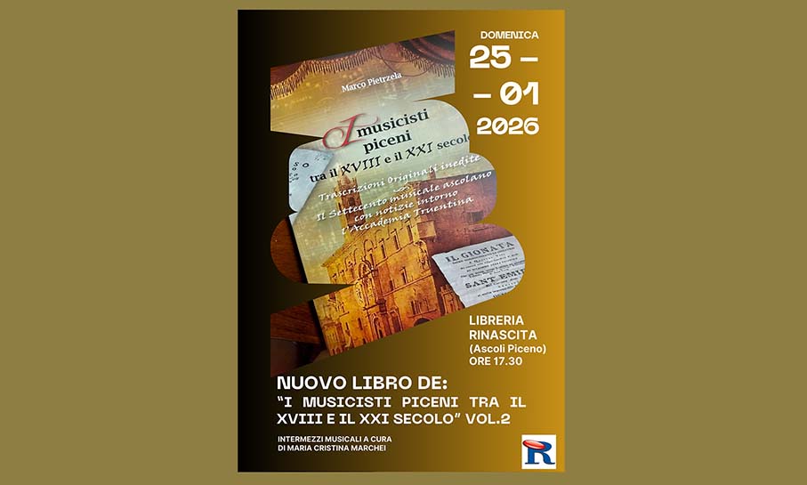 ASCOLI PICENO – Domenica 25 gennaio alle ore 17.30 presso la Libreria Rinascita di Ascoli Piceno si terrà la presentazione dell’ultimo volume della collana “I Musicisti Piceni tra il XVIII e il XXI secolo”. Composta di ben quattro volumi, la raccolta porta alla luce molti aspetti della vita musicale del territorio piceno, a partire dal 1700 per arrivare ai nostri giorni con le opere di Giovanni Allevi. Quest’ultimo volume, scritto in forma accessibile e chiara, è diviso in due macro-sezioni: la prima, con trascrizioni di brani musicali inediti di compositori del Piceno che giacevano inedite da secoli presso istituti pubblici e privati; la seconda, con un approfondimento del ‘700 tratta, tra l’altro, di storia locale, Teatro, Accademia Truentina, opere e interpreti del passato e della Banda cittadina ascolana. La pubblicazione, realizzata grazie all’Associazione Egeria di Ascoli Piceno, è frutto di una ricerca decennale del flautista e compositore ascolano Marco Pietrzela Cauti che, negli ultimi anni, ha anche curato ricerche e stampe inerenti la musica popolare e tradizionale picena. La grafica e l’impaginazione sono state curate dall’artista Marco Zaini. Un’occasione importante per riscoprire il nostro passato musicale così ricco e di grande interesse ma allo stesso tempo spesso dimenticato. Gli intermezzi musicali saranno a cura della giovanissima flautista Maria Cristina Marchei. L’ingresso è libero.