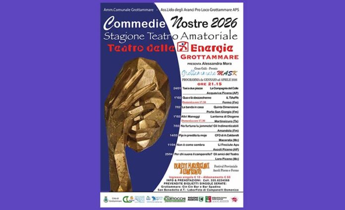 GROTTAMMARE – Dopo il successo di “Una Rotonda sul mare”, la Pro Loco Lido degli Aranci si appresta a immergersi nella fantastica rassegna di Teatro Amatoriale Dialettale. Infatti sabato 24 gennaio alle ore 21.15 al Teatro delle Energie si parte con “Commedie Nostre” arrivata alla sua ventiduesima edizione che già rimarrà impressa per il record dei tantissimi abbonamenti venduti. Ben otto appuntamenti in calendario con compagnie marchigiane e abruzzesi che si sfideranno per contendersi l’ambito premio del “Grottammare Mask” e il Premio Fita di “Dialetti Marchigiani a Confronto” per le semifinali della Provincia di Ascoli Piceno e Fermo, grazie alla Collaborazione che va avanti da ormai diversi anni con la Fita Marche a cui va un grande ringraziamento. L’organizzazione è a cura dell’Associazione Lido degli Aranci Pro Loco Grottammare Aps con il patrocinio del Comune di Grottammare.