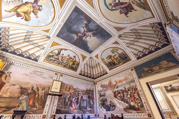 Palazzo Sciarra, sede della Banca del Piceno – Credito Cooperativo. Il palazzo, edificato dalla famiglia Sciarra, attiva ad Acquaviva fin dal ‘400, è frutto di stratificazioni secolari, e poggia sulle mura difensive del borgo. Gli interni, oggi sede degli uffici della Banca del Piceno (normalmente chiusi al pubblico), custodiscono tesori di epoche diverse, come un raffinato ciclo decorativo del 1840 in stile pompeiano e tardo neoclassico.