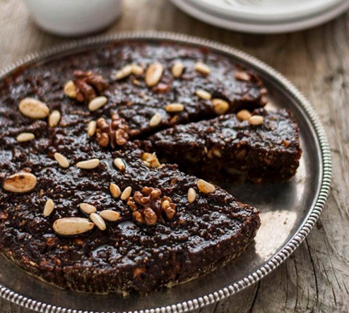 Se i fichi sono duri tenerli a bagno in acqua tiepida dalla sera prima. Poi farli bollire in vino bianco fino a che non siano ben morbidi, scolarli e asciugarli. Tagliarli a pezzetti in una terrina, unendo l’uvetta, il miele (o lo zucchero) e i canditi tritati. Le mandorle saranno state sbucciate e vanno tritate con le noci. Aggiungere il cioccolato, il caffè espresso e il caffè in polvere, il liquore misto, il vino cotto e l’olio. Insaporire con sale, noce moscata, cannella e scorza di arancia e limone grattugiate. Impastare il tutto con le mani mettendo un po’ di acqua calda, la farina e un po’ di pane grattugiato. Quando il composto è ben amalgamato, dalla sua consistenza dipenderà la bontà del dolce, metterlo in una teglia possibilmente di alluminio ben oliata e spolverata con il pane grattugiato. Livellarlo e decorare la superficie con mandorle, noci e canditi .