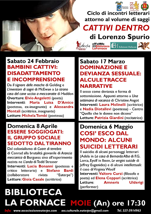 ANCONA – Sabato 24 febbraio alle ore 17,30, presso la Biblioteca La Fornace di Moie di Maiolati Spontini, si terrà il primo appuntamento del ciclo di eventi letterari che ruotano intorno al saggio “Cattivi dentro. Dominazione, violenza e deviazione in alcune opere della letteratura straniera” (Helicon, Arezzo, 2018) di Lorenzo Spurio. L’evento è patrocinato dal Comune di Jesi e dalla Provincia di Ancona. L’opera, che si apre con una breve nota critica di Lucia Bonanni, è risultata vincitrice assoluta del Premio Letterario Casentino di Poppi (Arezzo) nella passata edizione – sezione inediti “Veniero Scarselli”.