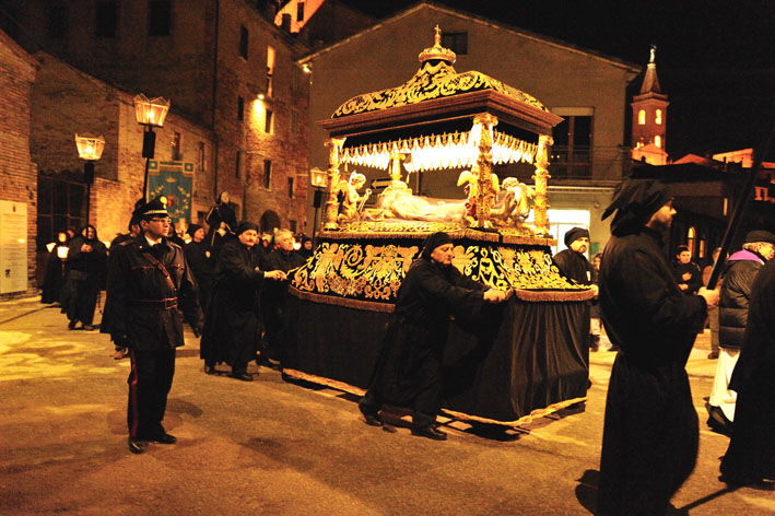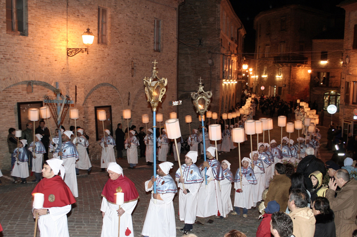 RIPATRANSONE – Ci sono tradizioni che resteranno sempre vive nel cuore dei ripani. Tra queste la più suggestiva e strettamente legata al folclore locale è la Processione del Cristo Morto con la statua della Madonna Addolorata, culto praticato fin dal lontano 1624 dai Confratelli e Consorelle della Misericordia e  Morte. La Processione partirà venerdì 30 marzo alle ore 20,30 dal Duomo Basilica intitolata a San Gregorio Magno, effettuando un percorso in Piazza Condivi, Corso Vittorio Emanuele II, Corso Garibaldi, Viale Cellini, Viale Leopardi, Largo Speranza, per poi rientrare intorno alle ore 22 in Duomo per la Veglia Pasquale.  La cerimonia religiosa, guidata dai sacerdoti della città, sarà accompagnata dal Corpo Bandistico “Città di Ripatransone” diretto dal maestro Roberto Vespasiani, che eseguirà brani adatti alla circostanza, compresa la marcia funebre di Chopin e quella del compositore ripano Enrico Boccabianca. Al corteo parteciperanno  il clero, i ministranti (chierichetti), le cinque Confraternite ripane con le insegne della penitenza, cappuccio, candele, lampioni accesi; le autorità civili e militari, fedeli provenienti anche dai paesi limitrofi. Il culto del Cristo Morto nella Chiesa della Confraternita della Misericordia e Morte è forse il più antico rispetto agli altri praticati in loco. Infatti, dopo la concessione nel 1624 del sotterraneo della cattedrale, la Compagnia collocò subito una statua del Cristo Morto nell’urna sottostante la mensa dell’altare maggiore. Nel corso dei secoli sono state rinnovate la statua e la bara, sia nella struttura che nei rivestimenti. Le attuali risalgono al 1910: la statua in cartapesta è opera dello scultore Giuseppe Manzo di Lecce, mentre il disegno della bara è stato realizzato dal professore ripano Guido Pezzini. Il rivestimento in stoffa di velluto nero e fili d’oro, invece, è frutto del laboratorio di ricamo delle Monache Domenicane. Da sottolineare che su invito del dott.Flavio Piergallini, Governatore della Confraternita della Misericordia e Morte, contribuirono alla spesa per la nuova bara anche alcuni Fratelli trasferitisi a Buenos Aires, ovvero Marino Massi, Giuseppe Cimadamori, Francesco Perazzoli, Francesco Angelici, Saverio Gentileschi, Franco Castelli, Ubaldo Maroni. Al termine della Processione la statua della Madonna Addolorata e il Cristo Morto saranno riaccompagnati  nella Chiesa di San Giovanni Decollato della Confraternita della Misericordia e Morte. Il programma religioso ripano inerente l’Ottava di Pasqua, festa in onore della Madonna di San Giovanni patrona della Città e Diocesi, proseguirà domenica 1 aprile, alle ore 11 in Duomo, con la Santa Messa Solenne.