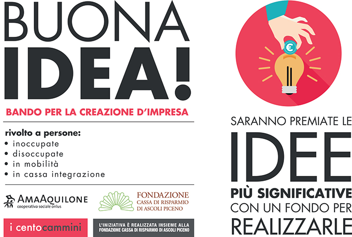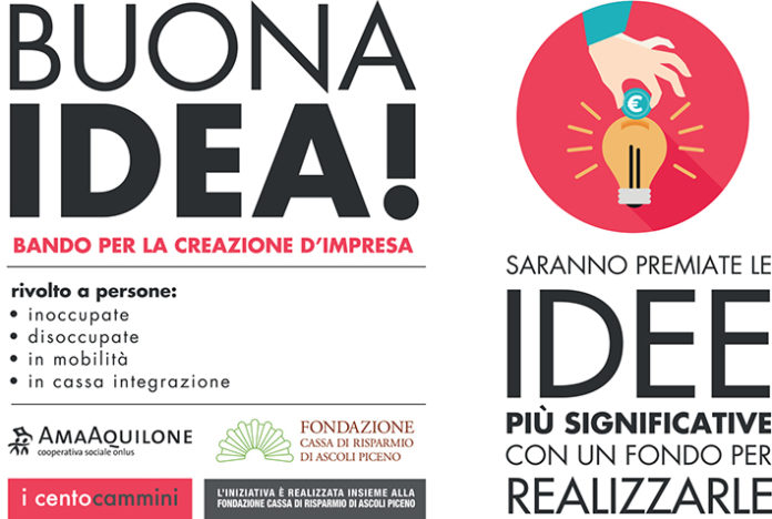 CASTEL DI LAMA – La Cooperativa Sociale Ama Aquilone insieme alla Fondazione Cassa di Risparmio di Ascoli Piceno, nell’ambito del progetto “i cento cammini“, realizzato all’interno del Piano pluriennale 2017-2019, per sostenere l’economia locale, premia le idee imprenditoriali più significative, mettendo a disposizione 40 mila euro per l’avvio di imprese da parte di persone disoccupate, inoccupate, in mobilità e in cassa integrazione. Con il bando “Buona idea!” Ama Aquilone Cooperativa Sociale Onlus e Fondazione Cassa di Risparmio di Ascoli Piceno insieme vogliono stimolare la creazione di impresa supportando aspiranti imprenditori, nel percorso di avvio di un’attività nel territorio piceno. Il bando rientra all’interno dei nuovi ambiti d’intervento realizzati dal progetto “i cento cammini“, nati con l’obiettivo di supportare persone e famiglie in difficoltà economica attraverso un percorso dedicato all’avvio d’impresa.