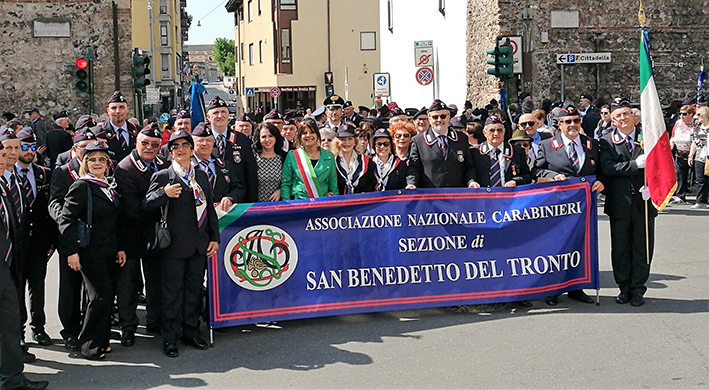 VERONA – Si è svolto a Verona dal 19 al 22 aprile 2018 il XXIV Raduno Nazionale dell’Associazione Nazionale Carabinieri. Un evento straordinario che ha visto il suo culmine domenica 22 con la sfilata lungo Corso Porta Nuova dei Carabinieri in congedo di tutte le regioni d’Italia comprese anche quelli delle sezioni ANC estere. Alla sfilata, che ha raccolto circa 90.000 persone, erano presenti tutte le sezioni delle Marche rappresentate dal Generale Tito Baldo Honorati, ispettore delle Marche. Tra le sezioni, spiccava l’ANC di San Benedetto del Tronto, sia perché era tra le più gremite (dietro allo striscione hanno sfilato oltre 60 componenti sambenedettesi) sia perché era rappresentata anche dalla presenza istituzionale del Comune: a sfilare in testa alla sezione, accanto al vicepresidente Domenico Bonifazi (in rappresentanza del presidente Giampaolo Mantovani) e Giovanni Erbuto Consigliere dell’associazione, c’erano anche l’assessore alle Politiche della Pace Antonella Baiocchi e la consigliera Brunilde Crescenzi.
