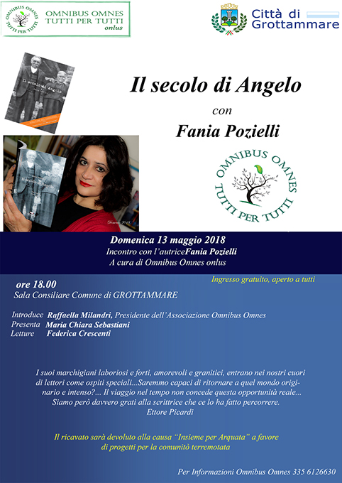 GROTTAMMARE – Domenica 13 maggio ore 18, nella Sala Consiliare del Comune di Grottammare, ci sarà la presentazione a cura della Omnibus Omnes Onlus, del libro “ Il secolo di Angelo” di Fania Pozielli, vincitore del Premio Arquata 2017. Questo incontro, oltre a promuovere il romanzo ambientato nel Piceno del secolo scorso, ha lo scopo per la Omnibus di parlare di Arquata del Tronto, in cui si sviluppa un capitolo dell’opera. La Omnibus infatti continua la sua campagna “Insieme per Arquata” attraverso la quale ha finora erogato, grazie alle donazioni ricevute, svariate borse di studio e bonus per la comunità montana terremotata. Proprio in quest’ottica, il ricavato netto della vendita de “Il Secolo di Angelo” verrà devoluto a favore dei terremotati di Arquata.
