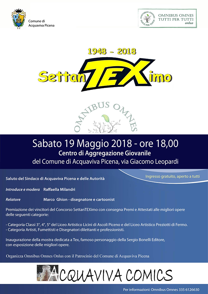 ACQUAVIVA PICENA – Sabato 19 maggio alle ore 18, al Centro Aggregazione Giovanile di Acquaviva Picena, verrà inaugurata la mostra delle opere dedicate a Tex Willer, il famoso personaggio della Sergio Bonelli Editore di cui ricorre il settantesimo anniversario. L’evento fa parte di Acquaviva Comics, organizzato dalla Omnibus Omnes e dal Comune di Acquaviva Picena. Interverrà Marco Ghion, disegnatore della Bonelli e cartoonist, che andrà invece in mattinata ad incontrare gli studenti dei Licei Artistici di Fermo e di Ascoli. In mostra sono esposte le migliori opere del concorso “SettanTEXimo”, selezionate da una giuria d’eccezione composta da sei affermati disegnatori che collaborano con la Bonelli: Fabiano Ambu, Andrea Bormida, Pasquale Del Vecchio, Pasquale Frisenda, Marco Ghion, Lucilla Stellato; da due famosi sceneggiatori della Bonelli, Pasquale Ruju e Moreno Burattini, che è stato recentemente ospite ad Acquaviva; e dal grande regista e cartoonist Bruno Bozzetto. Verranno premiati i migliori partecipanti del Liceo Artistico Licini di Ascoli e del Liceo Artistico Preziotti di Fermo, e la Categoria Artisti dilettanti e professionisti. Ecco alcuni commenti dei giudici. Fabiano Ambu: «Ho premiato con un voto alto il coraggio di mettersi in gioco e l’originalità esecutiva», Pasquale Ruju: «Bel lavoro da parte dei ragazzi», Lucilla Stellato: «I miei personali complimenti a tutti i partecipanti. Alcuni lavori mi hanno entusiasmato». Mentre i vincitori dei Licei saranno svelati pubblicamente il 19 maggio, si anticipa che per la categoria Artisti dilettanti e professionisti ha vinto Angelo Coletto di Crema, che ha deciso di rinunciare alla targa premio per donarne il costo a favore del progetto per Arquata della Omnibus. Alla inaugurazione della mostra interverranno il sindaco Pierpaolo Rosetti, le autorità di Acquaviva Picena, e la presidente Omnibus Raffaella Milandri, che preannuncia: «L’entusiasmo per questa prima edizione è tale che annunceremo presto la prossima: sempre con un concorso dedicato all’anniversario di un personaggio dei fumetti amatissimo». Grande attesa quindi per il 19 maggio e per le novità in arrivo. Al Centro Aggregazione Giovanile di Acquaviva è aperta al pubblico anche la Biblioteca dei Fumetti, intitolata a Giuseppe Milandri, di cui oltre 2000 volumi sono stati donati proprio dalla Milandri.