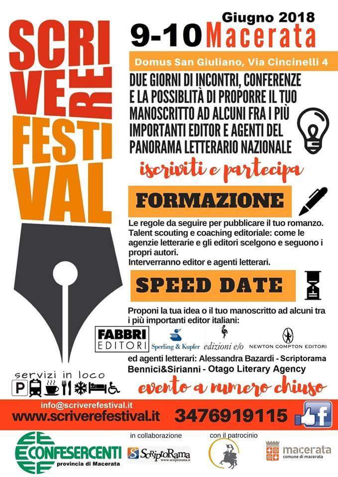 MACERATA – Torna a Macerata, sabato 9 e domenica 10 giugno nella cornice della Domus San Giuliano, “Scrivere Festival”, la rassegna letteraria giunta quest’anno alla quarta edizione, organizzata dall’associazione di categoria Confesercenti della provincia di Macerata, curata dagli scrittori Jonathan Arpetti e Christina Assouad. L’evento vede il patrocinio della Regione Marche, Comune di Macerata e Università degli Studi di Macerata. “Scrivere Festival” è dedicato principalmente a chi ama scrivere e a tutti gli scrittori che vorrebbero vedere pubblicata la propria opera, oppure migliorata e valorizzata. Si tratta di una manifestazione unica nel suo genere, dove gli iscritti avranno la possibilità di proporre la loro idea di romanzo e i loro manoscritti a importanti editor e agenti letterari italiani, con la formula dello speed date. Quest’anno saranno presenti editor delle case editrici Rizzoli, Sperling&Kupfer, edizioni e/o, Newton Compton mentre le agenzie letterarie saranno Bennici&Sirianni, Scriptorama, Otago e Alessandra Bazardi literary Agency. Questa formula è una caratteristica peculiare della manifestazione poiché consente ai partecipanti di confrontarsi direttamente, in un faccia a faccia, con gli addetti ai lavori e verificare in tempo reale la validità della loro idea di romanzo.