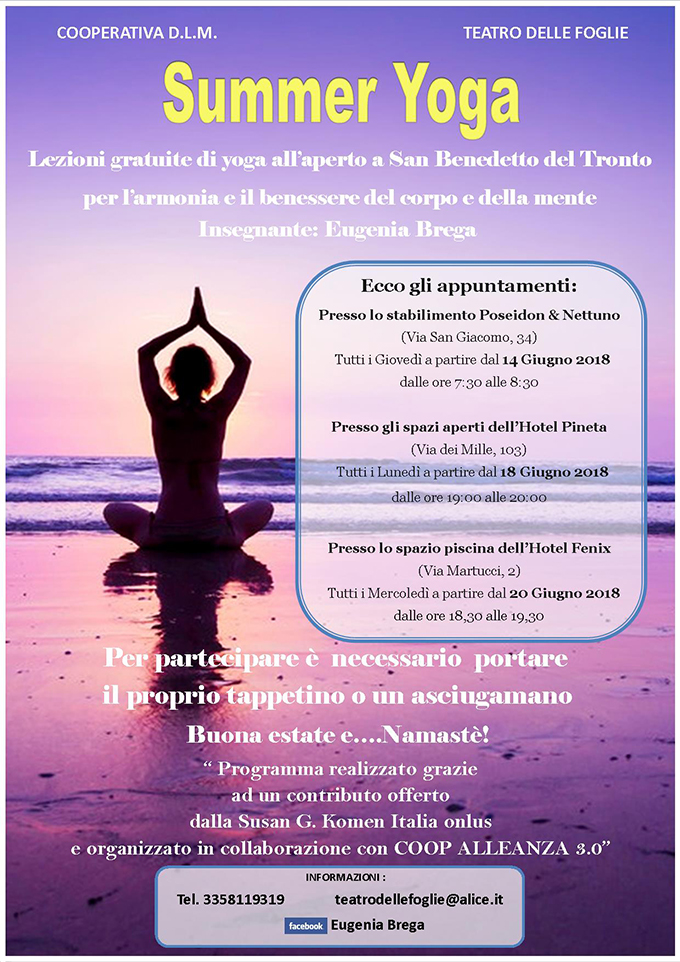SAN BENEDETTO DEL TRONTO – Sono ancora aperte le iscrizioni alle lezioni gratuite di yoga che prenderanno il via giovedì 14 giugno. L’iniziativa, organizzata dalla Cooperativa Sociale DLM e dal Teatro delle Foglie, rientra nel progetto “Laboratori territoriale di prevenzione del tumore al seno”, programma realizzato grazie ad un contributo offerto dalla Susan G. Komen Italia Onlus e in collaborazione con Coop Alleanza 3.0. Si tratta di lezioni gratuite di yoga all’aperto finalizzate all’armonia e al benessere del corpo e della mente curate dall’insegnante Eugenia Brega. Tre gli appuntamenti settimanali, tutti i giovedì dalle ore 7,30 alle 8,30 presso lo stabilimento Poseidon & Nettuno (in via San Giacomo 34 a partire dal 14 giugno), tutti lunedì dalle ore 19 alle 20, a partire dal 18 giugno, presso gli spazi aperti dell’Hotel Pineta (in via dei Mille 103), tutti i mercoledì dalle ore 18,30 alle 19,30, a partire dal 20 giugno presso lo spazio piscina dell’Hotel Fenix in via Martucci 2. Per partecipare è necessario portare il proprio tappetino o un asciugamano. Per maggiori informazioni si possono contattare i seguenti recapiti: 3358119319 e teatrodellefoglie@alice.it oppure visitare il sito www.cooperativemarche.it
