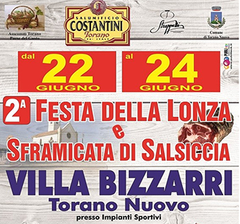 Dal 22 al 24 giugno l’associazione “Torano-Paese del gusto” organizza la 2° “Festa della lonza cotta e sframicata di salsiccia” nella frazione di Villa Bizzarri, presso gli Impianti Sportivi –