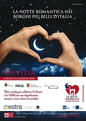 OFFIDA – Sabato 23 giugno a Offida, come in tutti i Borghi più Belli d’Italia, si terrà la terza edizione de “La Notte Romantica”, con cene a lume di candela e musica. «Dopo il successo di Hors Lits continua l’estate offidana – commenta l’Assessore al Commercio, Isabella Bosano – una notte che valorizza il borgo e in cui tutte le attività parteciperanno con singole iniziative nei locali con cene e aperitivi a tema e musica. Un momento di valorizzazione del territorio e del commercio». L’evento nazionale è organizzato dall’Associazione e lo scorso anno ha raccolto grandi consensi e grande partecipazione di pubblico facendo registrare circa un milione di visitatori, in soli tre anni si è rivelato uno degli eventi più interessanti nel panorama delle manifestazioni turistico-culturali e di intrattenimento del nostro Paese. Main media partner della manifestazione è la Rai e la Tgr – testata giornalistica regionale – è media partner. Inoltre, anche quest’anno saranno proposti un Challenge Instagram, denominato #BorgoRomantico2018, e un Concorso di Poesia, che nelle precedenti edizioni hanno avuto un grande seguito. Quest’anno “La Notte Romantica” si svolgerà in contemporanea anche in Spagna, in Francia e in Belgio e l’associazione lavorerà affinché l’evento possa presto diventare una manifestazione che unisca tutti i Paesi europei. «I Borghi più belli d’Italia – dichiara il Presidente dell’associazione Fiorello Primi – con la Notte Romantica hanno dimostrato come da un’idea semplice possa nascere un grande evento nazionale, un format che da quest’anno è stato “copiato” dai nostri partner internazionali, a sottolineare quanto l’ Italia nel campo della Bellezza, dell’accoglienza e dell’ospitalità abbia una leadership incontrastata. Basta solo rendersene conto».