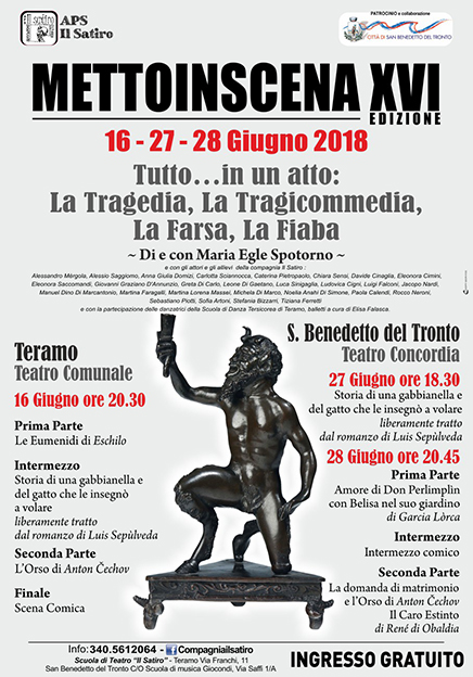 SAN BENEDETTO DEL TRONTO – Torna in Riviera “Mettoinscena”. La nota manifestazione, patrocinata dal Comune di San Benedetto del Tronto, è giunta alla sua sedicesima edizione con la direzione artistica di Maria Egle Spotorno e gli attori della compagnia “Il Satiro”. L’evento quest’anno sarà al Teatro Concordia per due giorni: mercoledì 27 giugno alle ore 18,30 con uno spettacolo per bambini, la fiaba “Storia di una gabbianella e del gatto che le insegnò a volare”; mentre giovedì 28 giugno alle ore 20,45 in scena, per tutti, un  programma vario di atti unici dalla tragicommedia alla farsa ” Amore di Don Perlimplin per Belisa”di G.Lorca, “La proposta di matrimonio” e “L’orso” di A.Cechov, “Il caro estinto” di R.De Obaldia. L’ingresso è gratuito. Info: 340/5612064, Compagniailsatirof@