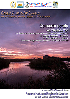 SAN BENEDETTO DEL TRONTO – Dopo il grandissimo successo del concerto all’alba per il Solstizio d’Estate, è in programma un nuovo appuntamento con la musica classica nella Riserva Naturale Regionale Sentina. Il secondo dei quattro concerti in programma per questa Estate 2018 si svolgerà, sabato 7 luglio alle ore 20, di fronte alla Torre sul Porto. Questa volta la suggestiva esibizione si terrà nelle ore serali per assistere al tramonto del sole, a contatto con la natura, nella magica cornice della Riserva. I giovani musicisti della Kinder Orchestra, diretta dal Maestro Sergio Capoferri, eseguiranno brani tratti dal repertorio classico. L’appuntamento per il concerto serale “Al tramonto”, è quindi sabato 7 luglio alle ore 20 presso la Torre sul Porto. Una bellissima esperienza musicale da vivere insieme, accompagnati dalla magica luce del tramonto.