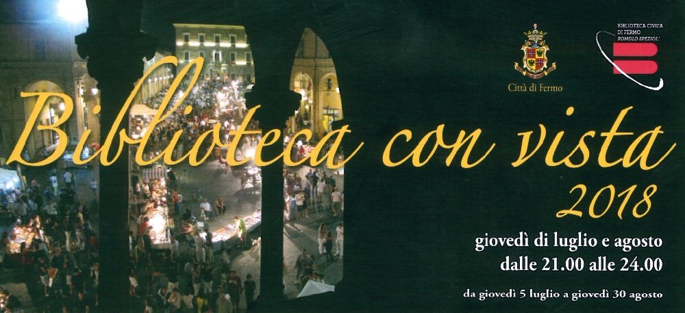 FERMO – C’è un modo insolito per gustare il fascino di Piazza del Popolo a Fermo. Per scoprirlo basta prendere in considerazione l’appuntamento di giovedì 5 luglio, alle ore 21, con la prima iniziativa della rassegna “Biblioteca con vista”, un programma che prevede l’apertura della Biblioteca Civica “Romolo Spezioli” dalle ore 21 alle 24 per un ciclo di presentazioni di libri che si alterneranno tutti i giovedì di luglio e agosto. Una rassegna pensata per valorizzare un importante spazio culturale del Comune di Fermo fuori dal consueto orario di fruizione.