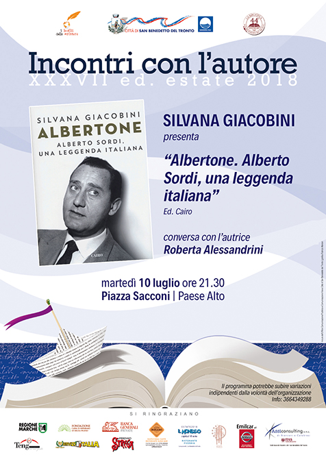 SAN BENEDETTO DEL TRONTO – Silvana Giacobini presenterà il libro “Albertone. Alberto Sordi, una leggenda italiana”, martedì 10 luglio alle ore 21,30 in Piazza Sacconi, al Paese Alto di San Benedetto del Tronto. Conversa con la scrittrice Roberta Alessandrini. L’evento è organizzato dall’Associazione “I Luoghi della Scrittura”, dalla Libreria La Bibliofila con il patrocinio e il sostegno dell’Amministrazione Comunale.