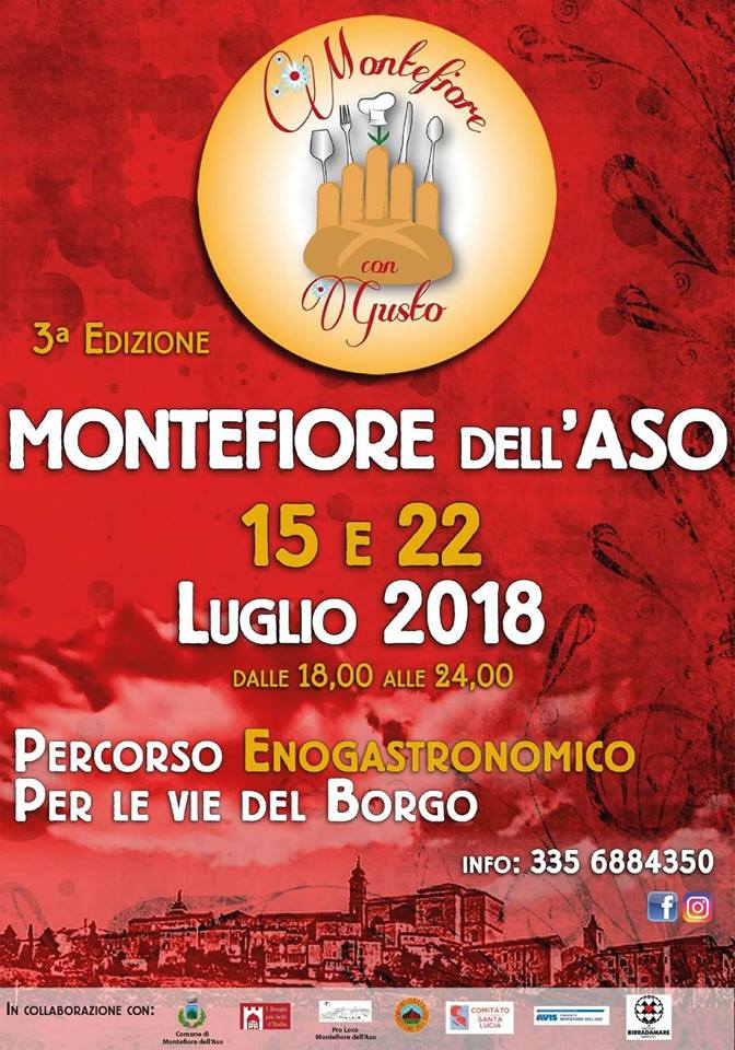 MONTEFIORE DELL’ASO – Vivere la sublime bellezza di un borgo antico deliziando il palato con l’accostamento di piatti ricercati e vini sapientemente selezionati: questo è “Montefiore con Gusto”. Il 15 e il 22 luglio a Montefiore dell’Aso ci sarà un percorso enogastronomico con sette isole di degustazione e verrà allestito anche un pub street in cui gustare la freschezza della birra artigianale. Un piccolo viaggio enogastronomico che avverrà in una cornice ricca di intrattenimenti: mostre fotografiche, mostre d’arte, gruppi musicali (tra cui il cantautore sangiorgese Francesco Mircoli), aree ludiche per i più piccoli, laboratori didattici organizzati dall’associazione infiorata. Sarà inoltre possibile visitare il Museo dell’orologio. L’evento si concluderà con uno spettacolo finale nella piazza principale. Da segnalare la presentazione del romanzo “Il sussurro dell’angelo. Un nuovo enigma per Giulia Masci” di Anna Rita Cinaglia, domenica 15 luglio alle ore 19,30 presso il Belvedere De Carolis. La trama del libro? “Un enigma scottante, intrighi, logge massoniche, misteri, arte e il più grande enigma di tutti i tempi. Un thriller che vi condurrà dai borghi medievali italiani a New York”.