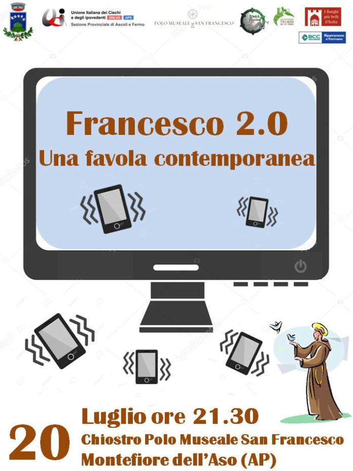 MONTEFIORE DELL’ASO – Nuovo appuntamento dell’ambito della XIII rassegna montefiorana “Teatro in Piazza”. Anche quest’anno gli studenti del corso di teatro dell’Unione Nazionale Ciechi e Ipovedenti di Ascoli Piceno e Fermo presentano una favola moderna, un po’ realistica e un po’ onirica:“Francesco 2.0 – Una favola contemporanea”Venerdì 20 luglio alle ore 21,30, sul palco del Chiostro del Polo Museale di San Francesco a Montefiore dell’Aso, si alterneranno sette attori cambiando ruoli e personaggi, per parlare proprio del rapporto con il frate povero nel nuovo millennio. La pièce è ambientata in un unico luogo, un ufficio, e nell’arco di un’intera, sfinente, giornata lavorativa. Il pubblico potrà così sorridere insieme delle nostre debolezze umane senza moralismi e senza semplici risposte. Questo spettacolo, con ingresso gratuito, è organizzato dall’Amministrazione Comunale di Montefiore dell’Aso.