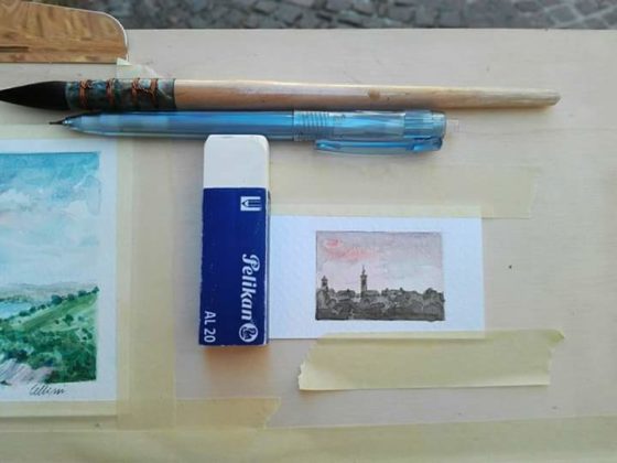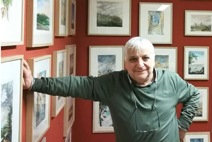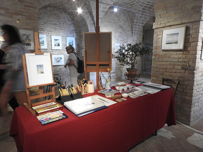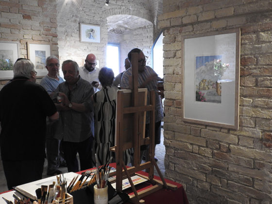 Le opere di Cellini infatti respirano, hanno una vita propria, incantano, sono lo specchio fedele dell’anima di un artista nato a Ripatransone nel 1952, dove risiede e dove ha una collezione permanente all’interno del suo studio, una chiesa romanica ristrutturata posta all’ingresso del corso principale del paese. I “Paesaggi dell’anima” del maestro architetto (Cellini ha frequentato l’Università di Architettura di Pescara per poi abilitarsi a Firenze, città da lui amatissima), sono esposti nella Cripta in via Ghisleri, messa a disposizione dalla Confraternita “Madonna di San Giovanni” e situata nel cuore del centro storico di Ripatransone, dove la mostra è visitabile ogni giorno fino al 15 agosto, dalle ore 9,30 alle 13 e dalle 16 alle 23,30. Bagno di folla per l’inaugurazione e numerose le visite giornaliere di residenti e turisti che, ammirati, osservano con attenzione gli acquelli e le miniature che il maestro definisce simpaticamente “acquerellicchi”. «In mostra ci sono la mia collezione di acquerelli e pennelli raccolti in cinquant’anni di attività – spiega Cellini – Ho raccolto le opere in diverse categorie: “Ripatransone”, “Scorci delle Marche” e “Appunti di viaggio” in cui sono ritratte le città che ho visitato, in particolare Firenze, Urbino e Venezia».