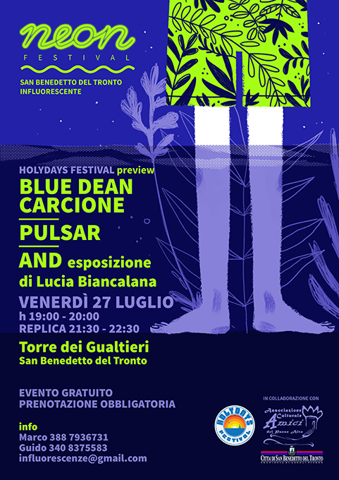 SAN BENEDETTO DEL TRONTO – Venerdì 27 luglio Neon Festival e Associazione Culturale “Amici del Paese Alto” ospiteranno, all’interno della Torre dei Gualtieri del Paese Alto di San Benedetto del Tronto, tre artisti umbri in collaborazione con Holydays Festival. L’Holydays Festival 2018, rassegna di musica underground con artisti nazionali e internazionali, giunge alla sua quarta edizione nella regione Umbria: quest’anno si svolgerà a Collepino (Spello, Perugia) il 3, 4 e 5 agosto. Il felice sodalizio tra i due festival nasce da una forte necessità di incontro della realtà locale sambenedettese con quelle che circondano la provincia e la regione , senza le quali non sarebbe possibile una crescita culturale alimentata soprattutto dalla curiosità dello spettatore. Alle ore 19 inizierà il primo concerto con gli artisti Blue Dean Carcione (traditional american folk) e Pulsar (ambient/electro) di Foligno a cui seguirà una replica alle ore 21,30. Durante l’intera serata, inoltre, sarà possibile ammirare la mostra AND dell’illustratrice perugina Lucia Biancalana. L’evento è gratuito con prenotazione obbligatoria a causa di posti limitati.