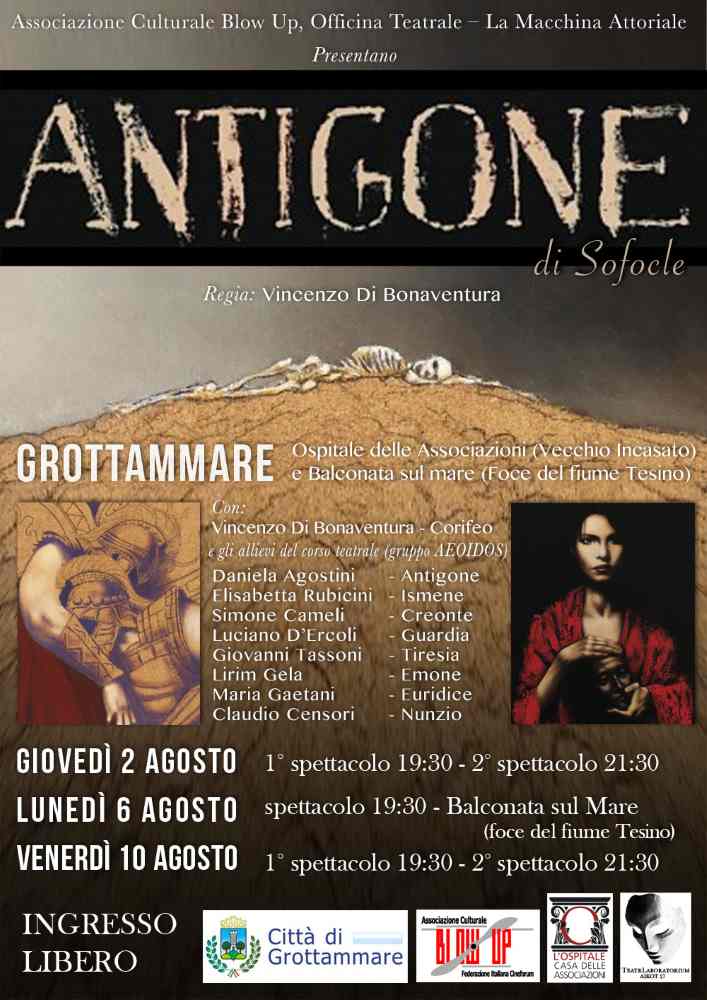 GROTTAMMARE – Con il patrocinio della Città di Grottammare, l’Associazione Culturale Blow Up e Vincenzo Di Bonaventura presentano cinque repliche dell’Antigone di Sofocle, messa in scena dagli allievi della scuola di teatro “Officina teatrale – La macchina attoriale”, progetto dell’associazione Blow Up e del Teatrlaboratorium Aikot 27, condotta dal maestro e regista teatrale Vincenzo Di Bonaventura. Antigone è volontà umana accordata con la pietà. I valori che onorano la vita sono però sottoposti al vaglio macchinico delle leggi degli uomini non in accordo con quelle divine. Antigone è rottura. É implacabilità, è sconvolgimento dello Stato. Non è contro, è decisionale, è azione, è rito, è conservazione del cuore in nome dell’onore. Il teatro antico di Sofocle questa volta non indaga su una verità da scoprire, ma scopre una verità da indagare. Il dibattito è oppositivo e già nutre i germi del fallimento. Resta il buon senso. Esso è comune. É non scritto. É rappacificante. Eppure per primo viene respinto. La figlia di Edipo e il figlio di Creonte sono i vertici di un uso autentico del senso risolutivo sulle cose opposte, ma le loro volontà alte ed esemplari, in quanto ferme e disciplinate da risorse del cuore, convergono verso l’annullamento e la devastazione, come ultimo grido contro la cecità delle sentenze. Antigone è sacrificalità d’onore per onore. É l’impeto della scelta mai discussa. É indiscutibilità d’amore. Una delle tragedie più violente e più contraddittorie del teatro antico.