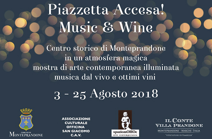 MONTEPRANDONE – Nell’ambito della mostra d’arte contemporanea “Accesa! Arte illuminata”, venerdì 3 agosto prenderà il via la manifestazione “Piazzetta Accesa! Music & Wine”. Patrocinata dal Comune di Monteprandone, l’iniziativa è organizzata dall’associazione culturale Officina San Giacomo e dallo spaziomOHOc di Nazareno Luciani in collaborazione con la Cantina “Il Conte di Villa Prandone”. Tutte le sere, fino a sabato 25 agosto, dalle ore 19 in poi, sarà possibile vivere atmosfere magiche nel vecchio borgo tra arte, vino e musica. Oltre a visitare la mostra dal titolo “X Sottrazione” – curata da Serena Scolaro a Palazzo Parissi con opere di Mirko Amaolo, Francesco Gioacchini, Jacopo Malossetti, Madalina Rossi, Paolo Sacchini, Giorgio Staffolani, Tom Jasper Tom e Giovanni Xie – ci sarà l’opportunità di fermarsi in Piazza IV Novembre per degustare un buon calice di vino e ascoltare musica dal vivo. Durante la manifestazione sarà possibile effettuare una passeggiata per conoscere i monumenti, i musei, le piazze, i vicoli più suggestivi del Centro Storico. Per informazioni e prenotazioni 347/7725772.