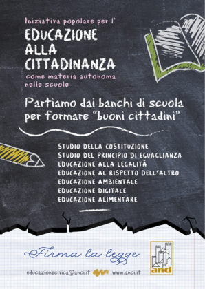 «L’ordinamento attuale, in vigore dal 2008, non garantisce in ambito scolastico lo sviluppo delle competenze di Cittadinanza e Costituzione poiché esse sono affidate in modo generico a tutti i docenti. A tale scopo, da più anni, cerchiamo attraverso il POF dell’Istituto Scolastico Comprensivo di lavorare su questi temi attraverso specifici progetti educativi – commenta il sindaco De Angelis – La proposta vuole che l’insegnamento dell’educazione alla cittadinanza diventi materia autonoma e con voto indipendente in modo che si trasmetta chiaramente agli studenti e alle loro famiglie il senso e l’importanza, coralmente riconosciuti, dell’essere cittadini competenti e consapevoli della loro appartenenza alla Comunità. I Comuni si metteranno quindi a disposizione per accompagnare con progetti integrativi dell’offerta formativa l’introduzione dell’ora autonoma di educazione civica e la conoscenza dei principi che regolano la vita consociata, già ritenute centrali fin dal 1958, quando fu Aldo Moro a proporre l’inserimento della disciplina dell’educazione civica nei curricula scolastica».