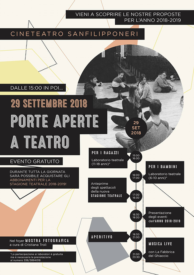 SAN BENEDETTO DEL TRONTO – Il CineTeatro San Filippo Neri apre le sue porte ad interessanti novità. L’estate è finita e si dà inizio ad una nuova stagione teatrale: tutto è pronto per mostrare al pubblico le proposte per il nuovo anno. E quale miglior occasione se non quella di invitare tutti a entrare in teatro e sentirsi come in casa di amici? A tal proposito l’Associazione Teatrale Caleidoscopio, gestore del CineTeatro, vi aspetta sabato 29 settembre dalle ore 15 per una giornata piena di eventi. “Porte aperte a teatro” vuole essere un’occasione per presentare al pubblico i progetti per il nuovo anno, in una cornice accogliente e conviviale. Entrati nel teatro, infatti, ad accogliere i presenti sarà la mostra fotografica “Performers”, a cura di Cristiana Troli, che svelerà i backstage di spettacoli e performance, e lo staff del teatro a cui si potrà chiedere tutto quello che c’è da sapere, dalle proposte 2018-2019 ai servizi offerti dal CineTeatro. Inoltre, ovviamente, durante tutta la giornata sarà possibile acquistare gli abbonamenti per la Stagione Teatrale 2018-2019. Un evento imperdibile e completamente gratuito, dunque, per conoscersi e scoprire l’offerta culturale di questo nuovo anno.