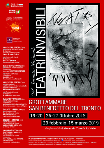 GROTTAMMARE – Omaggi al teatro e al fumetto per la 24a edizione dell’Incontro nazionale dei Teatri Invisibili, che parte da Grottammare venerdì 19 ottobre, con il primo fine settimana dedicato a Leo De Berardinis, uno dei più grandi attori, registi e drammaturghi contemporanei, scomparso dieci anni fa. Da Grottammare a San Benedetto, il calendario 2018 scorrerà tra spettacoli, libri, incontri e progetti per il futuro, diretti dal Laboratorio teatrale Re Nudo, con il patrocinio della Città di Grottammare e il sostegno della Regione Marche, AMAT, Fondazione Cassa di risparmio di Ascoli Piceno.