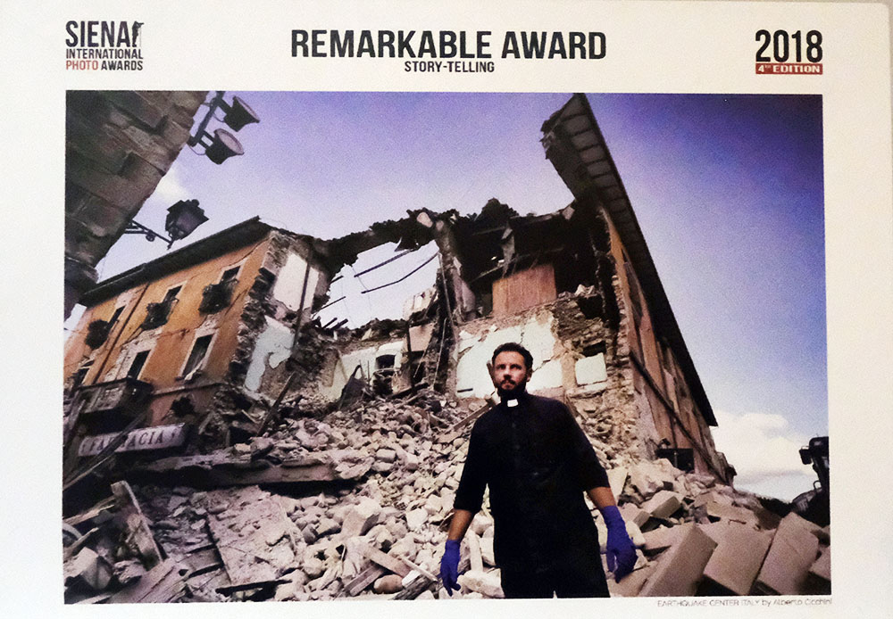 Tra questi il “nostro” Alberto Cicchini, che si è aggiudicato un Remarkable Awards 2018 con “Earthquake in center Italy” nella categoria Storyboard, ovvero nove immagini dedicate alle prime ore del sisma del 24 agosto 2016. Nove immagini che raccontano la tragedia: una donna a terra che aspetta soccorsi; sfollati davanti al convento di Amatrice; un ragazzo salvato tra le macerie; il parroco don Fabio Cammarota di Amatrice nella via principale devastata; i funerali con i vigili del fuoco e i palloncini bianchi simboli degli angeli in cielo; il Cristo con il braccio spezzato nella Chiesa di San Francesco di Accumoli; le vittime estratte dalle macerie dai soccorritori. Un autentico e straordinario racconto fotogiornalistico che, oltre al talento di Alberto Cicchini, trasmette emozioni a non finire ed è anche spunto di riflessione poiché punta l’accento non solo sulle inevitabili conseguenze di una tragedia, ma anche sulla dignità dei terremotati e la loro volontà di rinascere.