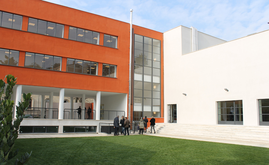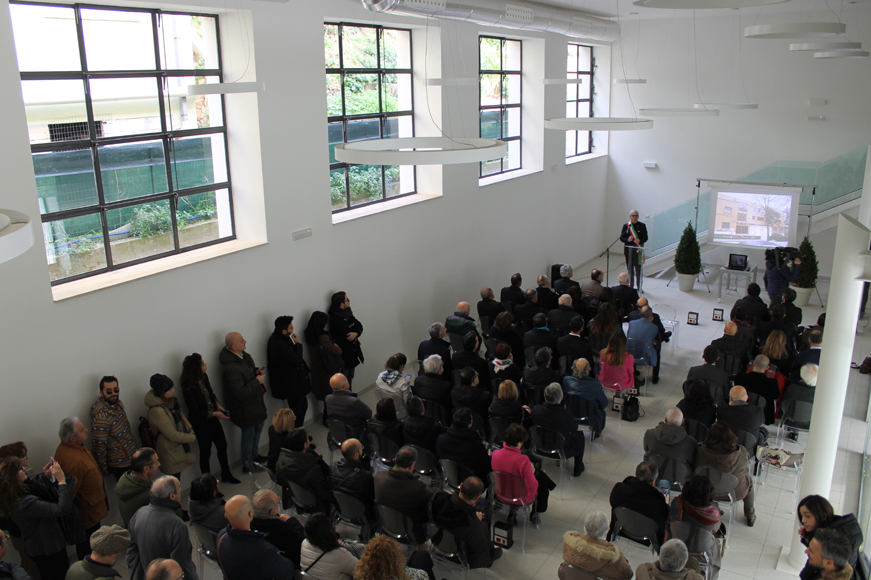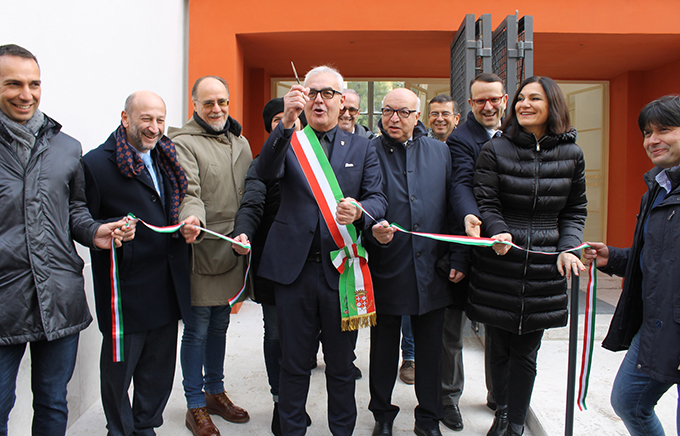 MACERATA – Recuperare, restaurare, rigenerare, rivivere. Sono le quattro parole chiave della gestione del patrimonio architettonico per l’Amministrazione comunale di Macerata e sono anche le linee guida che hanno portato oggi a restituire alla città, dopo un attento recupero, Palazzo Exgil, un gioiello dell’architettura razionalista, che ospiterà ora gli uffici dell’APM. C’era tanta gente questa mattina, sabato 1 dicembre, per il taglio del nastro del restaurato palazzo: autorità come il maggiore Luigi Ingrosso dei Carabinieri e il capitano Emilio Fuscellaro della Guardia di Finanza, il sindaco Romano Carancini con la giunta al completo, il presidente dell’APM Giorgio Piergiacomi con il direttore Stefano Cudini e lo staff tecnico e amministrativo, l’arch. Pierluigi Salvati della Soprintenenza delle Marche, l’ing. Tristano Luchetti del Comune e il suo staff tecnico e di progettazione dell’intervento. Ma soprattutto c’erano tanti maceratesi affezionati a questo storico edificio, situato lungo la via che congiunge il centro storico alla stazione, che hanno voluto vedere la sua rinascita, la sua trasformazione e il suo splendore.