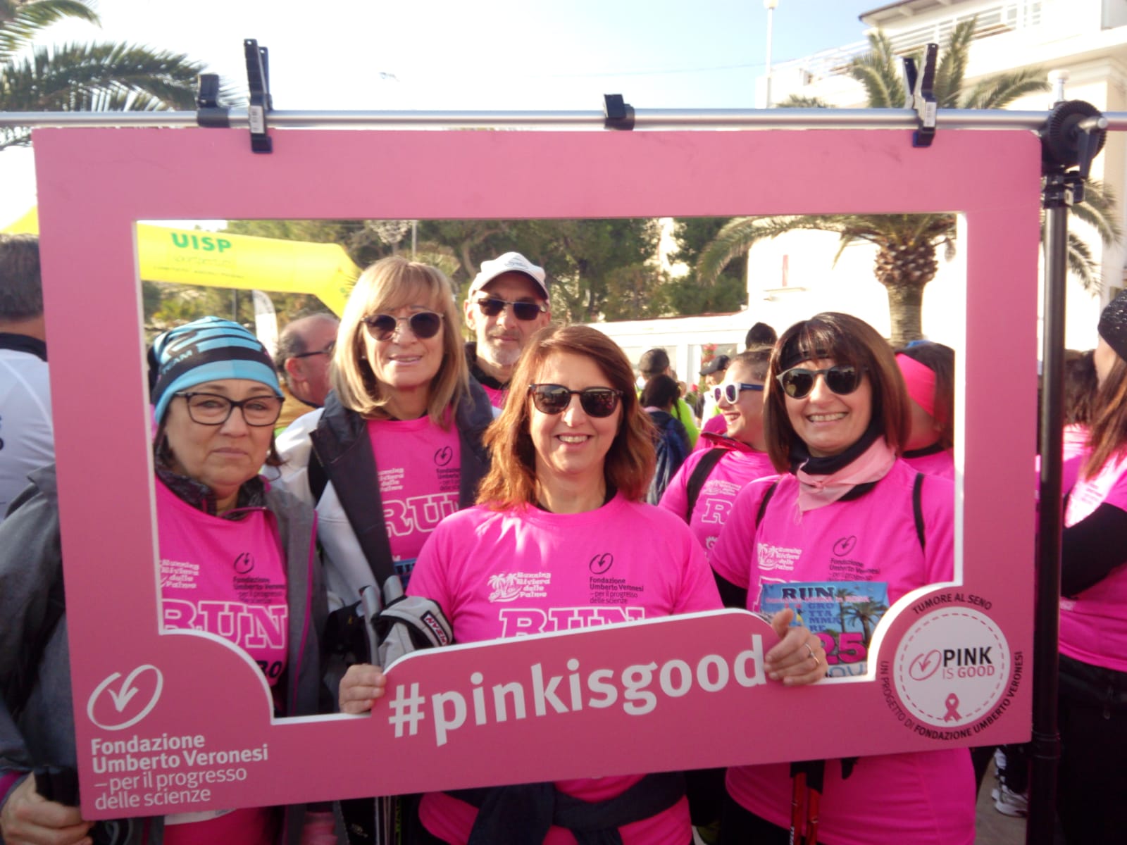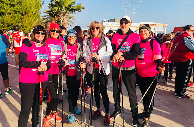 Non è un caso che il colore sia il rosa: simboleggia l’apertura all’accoglienza, all’intuito e all’amore in senso lato. Il rosa è affine alla sensibilità, alla tenerezza, alla delicatezza. É un colore elegante e raffinato. Ha il carattere della calma. E, in questa occasione, il rosa è anche la speranza e la fiducia di una buona salute, da preservare, da ritrovare. Ogni minuto che passa, in attesa della partenza, le persone iscritte aumentano, in un multiforme vocio, nell’andirivieni per la piazza, saluti ed abbracci, piccoli capannelli, cagnolini al guinzaglio. Abbigliamenti tecnici e non, giovani di tutte le età in calzoncini e maglietta ed altri in tuta e comode felpe avvolgenti. Tra gli uni e gli altri ci siamo anche noi, i “walkers” come ci piace chiamarci: i camminatori con i bastoncini, secondo la tecnica del Nordic Walking, della polisportiva Adriatico Team.