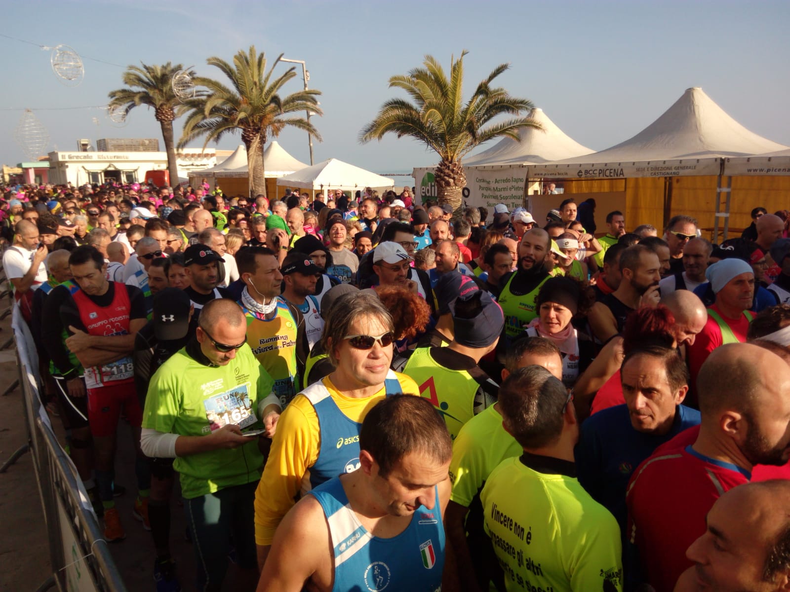 Sono quasi le 9,30, l’ora prevista della partenza. Ci si divide a seconda della disciplina scelta: si corre o si cammina. Il serpentone umano ha in testa coloro che partecipano alla corsa competitiva, dietro tutti gli altri. É un bel vedere. Il percorso prevede un primo tratto in direzione sud, fino al giardino sul mare a ridosso della foce del Tesino. Si gira e si torna a nord, ripercorrendo la piazza Kursall, proseguendo sul lungomare e sulla pista pedo ciclabile che congiunge Grottammare con Cupra Marittima, costeggiando il mare e la scogliera, passando per il 43° parallelo che oggi sembra avere colori nuovi e significati aggiunti. Da bambino pensavo ai paralleli geografici come a tante infinite ed invisibili mani che si tenevano strette per abbracciare il mondo ed oggi, questa ingenua visione infantile, sembra vera. Sembra reale. Ed ho l’impressione che il pensiero passi in altre menti regalando al camminare quella sottile percezione che l’umanità sa riconoscersi nelle occasioni giuste.