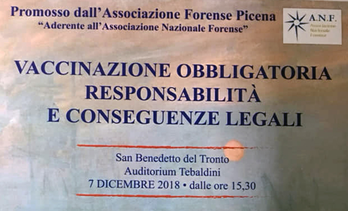 Organizzato dall’Associazione Forense Picena, un evento dedicato al tema dei vaccini obbligatori dal titolo “Vaccini Obbligatori. Responsabilità e conseguenze legali” –
