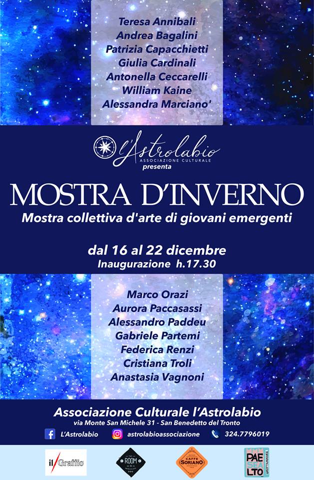 SAN BENEDETTO DEL TRONTO – “Mostra d’Inverno” è il titolo della collettiva che, dal 16 al 22 dicembre, impreziosirà la sede dell’Associazione Culturale L’Astrolabio, sita in Via Monte San Michele 31. L’inaugurazione è prevista domenica 16 dicembre dalle ore 17,30 alle 20, mentre gli orari di apertura della mostra negli altri giorni è dalle 18 alle 20. In esposizione ci saranno le opere degli artisti locali emergenti Teresa Annibali, Andrea Bagalini, Giulia Cardinali, Antonella Ceccarelli, William Kaine, Alessandra Marcianò, Marco Orazi, Aurora Paccasassi, Alessandro Paddeu, Gabriele Partemi, Federica Renzi, TrishaNipha, Cristiana Troli, Anastasia Vagnoni. La mostra è principalmente finalizzata alla vendita e il ricavato andrà a sostegno dell’attività degli artisti e dell’associazione. Sarà dunque una splendida occasione per conoscere e ammirare le opere e gli stili degli artisti associati, oltre che per acquistare un regalo non convenzionale, originale ed esclusivo. A sottolineare lo spirito con cui è stato creato questo evento è la presidente dell’associazione, Teresa Annibali: «Nella “Mostra d’Inverno 2018” l’associazione, come sempre, vuole mostrare le potenzialità del nostro territorio e della sua arte emergente seguendo quella che da sempre è la sua mission, ovvero portare davanti agli occhi di tutti il nostro tesoro artistico e creativo».