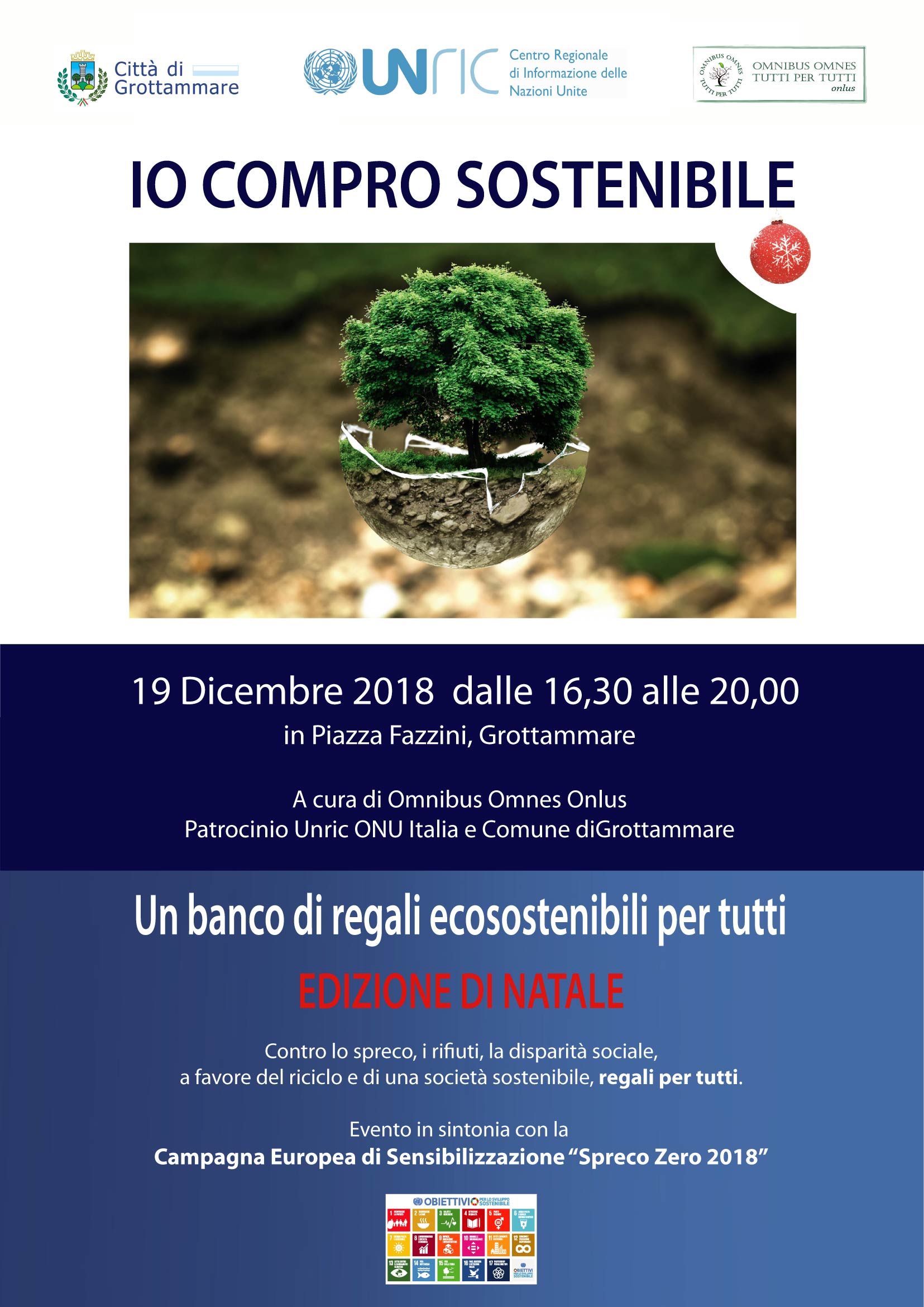 GROTTAMMARE – Mercoledì 19 dicembre dalle ore 16,30 alle 20, in Piazza Fazzini a Grottammare torna l’iniziativa “Io Compro Sostenibile “ della Omnibus Omnes, con il Patrocinio del Comune di Grottammare e della Unric Onu Italia. Un banco di regali completamente gratuiti, dove ognuno può prendere ma anche donare oggetti nuovi, seminuovi e in buono stato. «La riproposta per Natale della iniziativa è nata spontanea e calorosa a grande richiesta dei cittadini, dell’Amministrazione di Grottammare e dei nostri volontari. Tutti abbiamo degli oggetti che non usiamo e che possono fare la felicità di bambini, grandi e persone anziane, a costo zero.- spiega Raffaella Milandri, presidente della Omnibus – La nostra società dei consumi ci porta a comprare in continuazione, ma questo crea in ogni casa dei piccoli magazzini dove i soldi spesi sono inutili. Accatastare oggetti non fa felice nessuno. Donare invece, è nello spirito del Natale. Anche senza creare Pil». Appuntamento imperdibile per prendere regali, ma anche per donare sorrisi e oggetti utili. Non mancheranno abbigliamento e giochi per bambini, libri, dvd, foto d’autore, oggetti per la casa, decorazioni natalizie e tanto altro ancora. Il tutto sempre contro lo spreco e le disparità sociali, e a favore dell’ambiente.