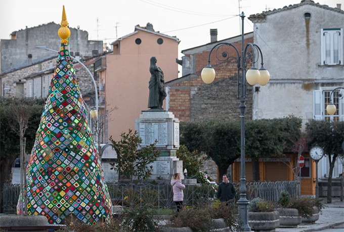 L’urban knitting è arrivato a vestire il simbolo iconico del Natale. Questa particolare espressione di street art, definita anche graffiti knitting – e cioè graffiti a maglia – ha lo scopo di “colorare il quotidiano” utilizzando su arredi urbani e spazi metropolitani, anziché vernici, dei rivestimenti realizzati con fili di lana o di cotone intrecciati ai ferri o all’uncinetto. É una tendenza, questa dell’urban knitting, che dagli Usa si è diffusa a partire dai primi anni duemila in tutto il mondo e che, in particolare, questo Natale è presente allo stesso modo in alcune piazze italiane.Troviamo un Albero di Natale, alto circa quattro metri, realizzato con quadrotti di lana all’uncinetto a San Giuliano Terme, in provincia di Pisa. Ne troviamo ancora in Toscana nelle piazze di Bettolle e Castelfiorentino, rispettivamente di tre e due metri. Poi in Molise, il più grande di tutti. Nel piccolo comune di Trivento si può ammirare fino al 6 gennaio un imponente e coloratissimo Albero di Natale realizzato cucendo insieme 1300 quadrotti di lana all’uncinetto, necessari per coprire le dimensioni di una struttura a forma di cono, alta sei metri con un diametro alla base di tre metri e mezzo.