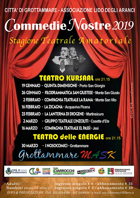GROTTAMMARE – Al via la quattordicesima edizione di “Commedie Nostre 2019”, la rassegna di teatro amatoriale del centro Italia organizzata dall’Associazione Lido degli Aranci e dal Comune di Grottammare.Dopo la prima serata di sabato 19 gennaio al Kursaal di Grottammare con la Compagnia “Quinta Dimensione” di Porto San Giorgio, diretta dal regista Lorenzo Roscioli, con la commedia brillante giallo comica dal titolo “L’appartamento novu”, autentico capolavoro in due atti del vernacolo marchigiano, presentato da Giuseppe Cameli, sarà la volta della Filodrammatica San Giustese di Monte San Giusto (26 gennaio). Seguiranno le commedie della Compagnia Teatrale “La Rama” di Monte San Vito (2 febbraio), La Zicagna di Acquaviva Picena (16 febbraio), La lanterna di Diogene di Martinsicuro (23 febbraio), Gruppo Teatrale L’Inzoliti di Casette d’Ete (2 marzo), Compagnia Teatrale El Passì di Jesi (16 marzo). Gran finale al Teatro delle Energie, il 30 marzo, con i Nosocomici di Grottammare. Biglietto di ingresso 6 euro, infoline 3475406630.