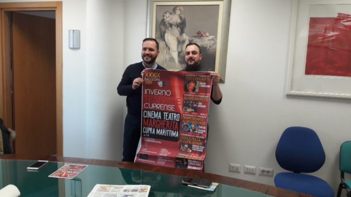 CUPRA MARITTIMA – Riparte l’Inverno Teatrale Cuprense che quest’anno raggiunge il traguardo della sua 39a edizione. La rassegna – composta da cinque spettacoli che si terranno nei venerdì di febbraio e marzo – si rinnova oltre che nella sua veste grafica, anche nella proposta degli spettacoli curati dall’assessore alla cultura Mario Pulcini coadiuvato dalla direzione artistica di Alessandro Rutili. Anche quest’anno, afferma l’assessore, ci saranno alcune novità: «La prima riguarda l’introduzione di uno spettacolo interamente musicale del cantautore Lucio Matricardi, che presenterà il suo ultimo lavoro discografico “Sogno Protetto”, l’altra novità riguarda invece il format degli spettacoli, non più a cadenza settimanale, bensì ogni quindici giorni, in modo da intervallare gli spettacoli teatrali con la programmazione cinematografica del Cinema Margherita. In questo modo – spiega l’assessore – diamo la possibilità al pubblico di partecipare a tutti gli spettacoli senza impegnarlo troppo con appuntamenti ravvicinati.