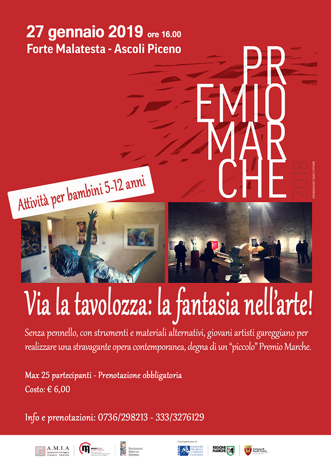 ASCOLI PICENO – Domenica 27 gennaio alle ore 16 presso il Forte Malatesta di Ascoli Piceno si terrà un laboratorio creativo rivolto a bambini dai 5 ai 12 anni. Dopo una divertente caccia al tesoro, giovani artisti senza pennello ma muniti di strumenti e materiali alternativi, gareggeranno per realizzare una stravagante opera d’arte contemporanea, degna di un “piccolo” Premio Marche. Secondo numerosi studi pedagogici, le attività artistiche nutrono l’evoluzione infantile, potenziano l’empatia, favoriscono lo sviluppo fisico-cognitivo così come le capacità espressive. Proprio per questo Ascoli Musei riserva un’attenzione particolare ai laboratori creativi ed esperienziali per bambini. Il prossimo appuntamento dedicato ai più piccini, “Via la tavolozza: la fantasia nell’arte” sarà un appuntamento spassoso, dinamico e formativo. Accanto ad operatori museali specializzati, i piccoli partecipanti creeranno un’opera d’arte contemporanea degna del Premio Marche.