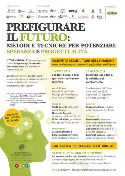 L’evento è aperto alla partecipazione gratuita di tutti: si può prenotare telefonando al numero 06/8082599 o mandando un sms al 3938165974 (inserendo nome, cognome, età, professione) oppure collegandosi al sito fondazionepatriziopaoletti.org/prefigurareilfuturo/ e compilando un semplice form. “Prefigurare il futuro, metodi e tecniche per potenziare speranza e progettualità” è un progetto ideato da Patrizio Paoletti e realizzato gratuitamente dalla Fondazione omonima. Il tour nazionale è partito lo scorso novembre in Umbria e sta facendo tappa in varie regioni del centro-sud Italia, affrontando di volta in volta una delle tre emergenze educative attuali: giovani e futuro (scuola e lavoro), ascolto e inclusione (promozione di processi comunicativi di pace), costruzione interiore (resilienza e superamento delle avversità).