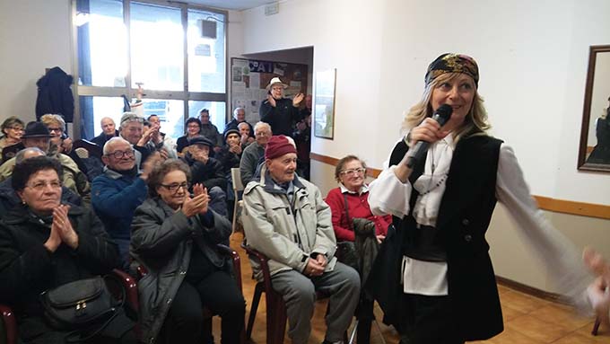 Ospite straordinario e sempre molto gradito, l’artista Angelo Carestia che con la sua satira, le sue parodie e i suoi personaggi, ha divertito e coinvolto tutti i partecipanti. Non sono mancate le rappresentazioni di scene di vita della San Benedetto di un tempo, con i bravissimi attori di dialetto locale, Vittoria Giuliani e Adriano Aubert. Le operatrici della Cooperativa Mano a Mano, Angela e Catia, insieme ai numerosi intervenuti hanno dato vita a simpatiche e divertenti coreografie, sulle note delle più famose colonne sonore carnascialesche. Il tutto condito da una deliziosa merenda gentilmente offerta dal Conad di Corso Mazzini.