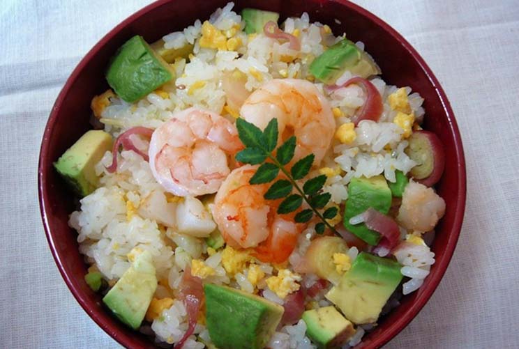 Preparazione: in uno scolapasta lavare il riso sotto il getto d’acqua corrente fino a quando l’acqua utilizzata non risulti limpida. Quindi, lasciar scolare il riso per 15 minuti // Poi versare il riso e i 500ml di acqua in una pentola e portare ad ebollizione. Abbassare la fiamma al minimo e senza la necessità di mescolare, lasciar cuocere fino alla completa evaporazione dell’acqua. Lasciare intiepidire per una decina di minuti // Intanto scaldare l’aceto fino a far sciogliere completamente lo zucchero e il sale aggiunti // Ora trasferire il riso in un contenitore largo e gradualmente, mediante un cucchiaio, aggiungere l’aceto coprendo tutta la superficie di riso. Mescolare delicatamente per distribuire l’aceto e per allargare il riso, affinché l’aceto evapori rapidamente. Lasciar raffreddare // Pulire e tagliare a fettine sia il pesce sia l’avocado // Infine, disporre il riso così preparato su quattro piatti, adagiarvi sopra armoniosamente le fette di avocado e di pesce, sormontate dai gamberetti e spruzzate di semi di sesamo // Condire in tavola con wasabi o salsa di soia.